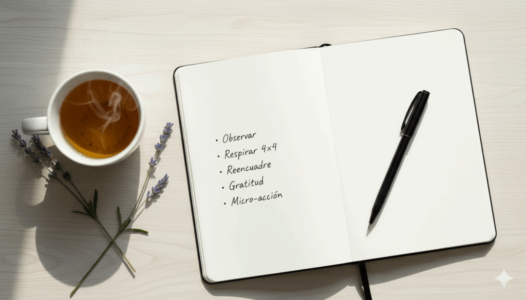 | 2 | Respiración 4×4 + una gratitud concreta. | 6–8′ |