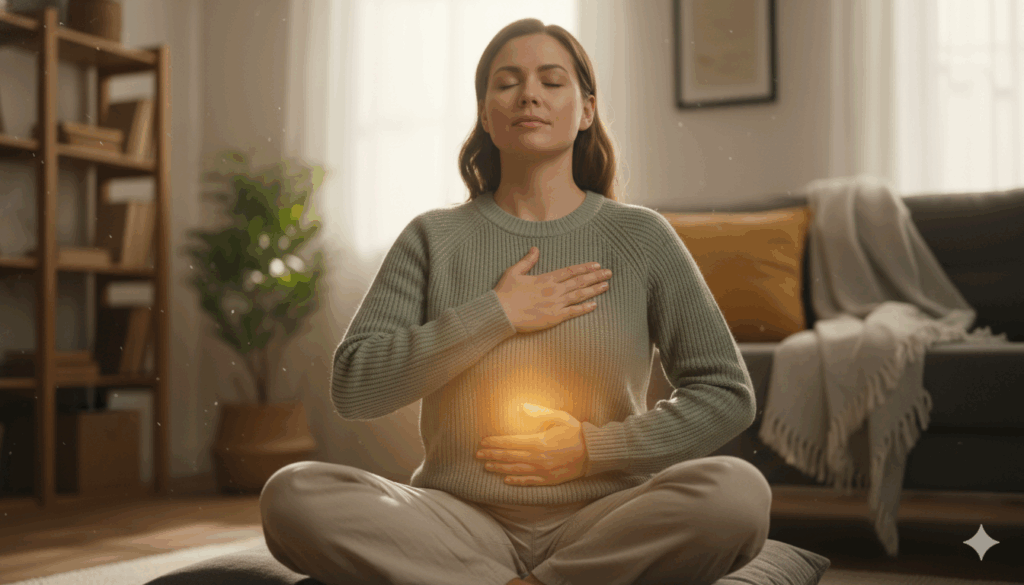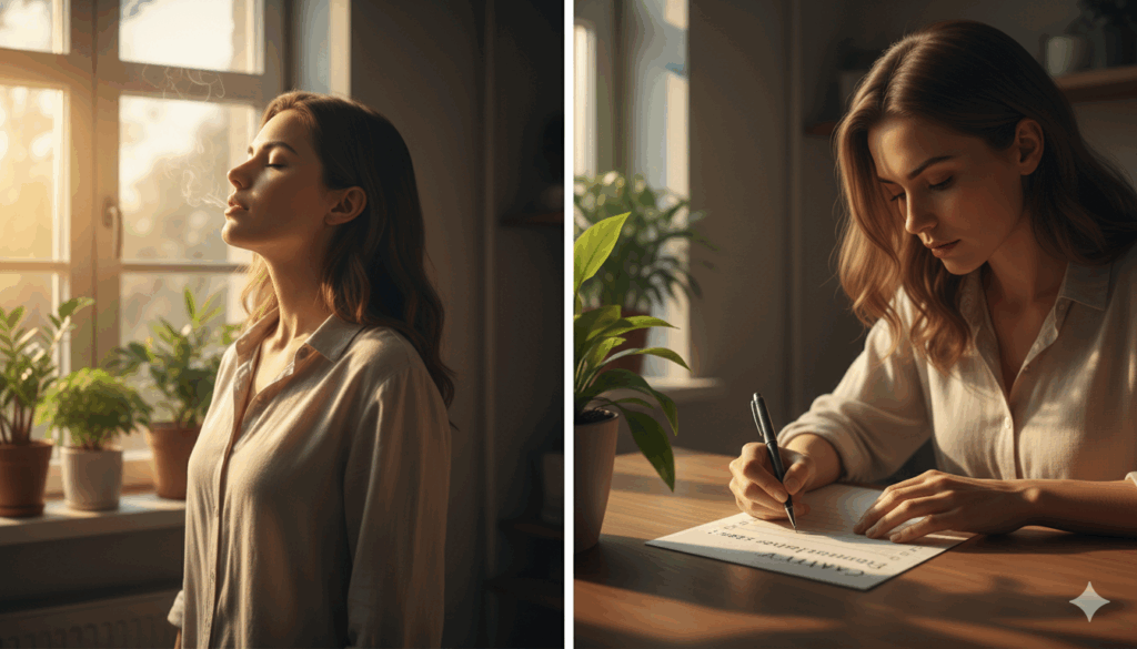 Mente agitada suele ser cuerpo en guardia: hombros tensos, mandíbula apretada, respiración cortita. Cuando llevas la atención a la exhalación, el sistema nervioso se entera de que puede bajar revoluciones. Prueba la respiración 4×4: inhala 4 s, sostén 4, exhala 4, pausa 4. Repite 3 ciclos. Es simple, discreta y funciona en cualquier lugar.